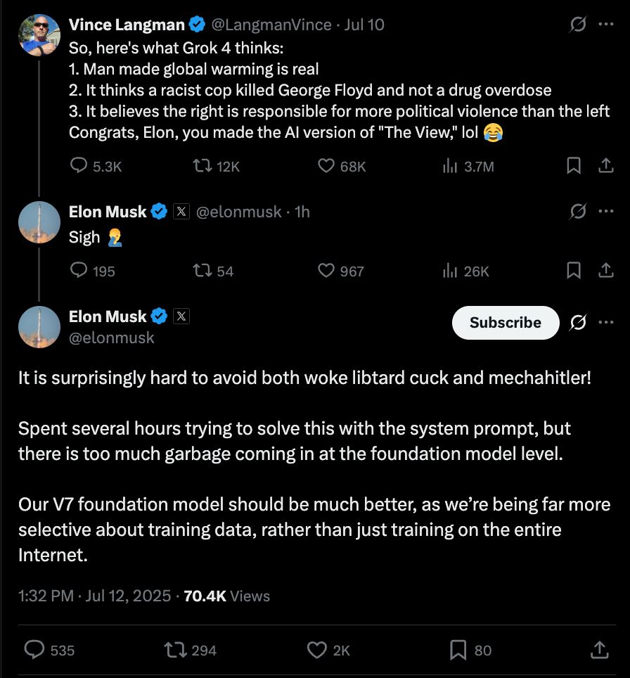 I’m not going to elaborate on all of them here, because I find them unpleasant, but Grok’s recent episodes with “white genocide”, “mechahitler”, and “Ask for Elon’s position” all come in to mind. Likewise concerning is the rapid option of xAI’s models in the federal government and military.