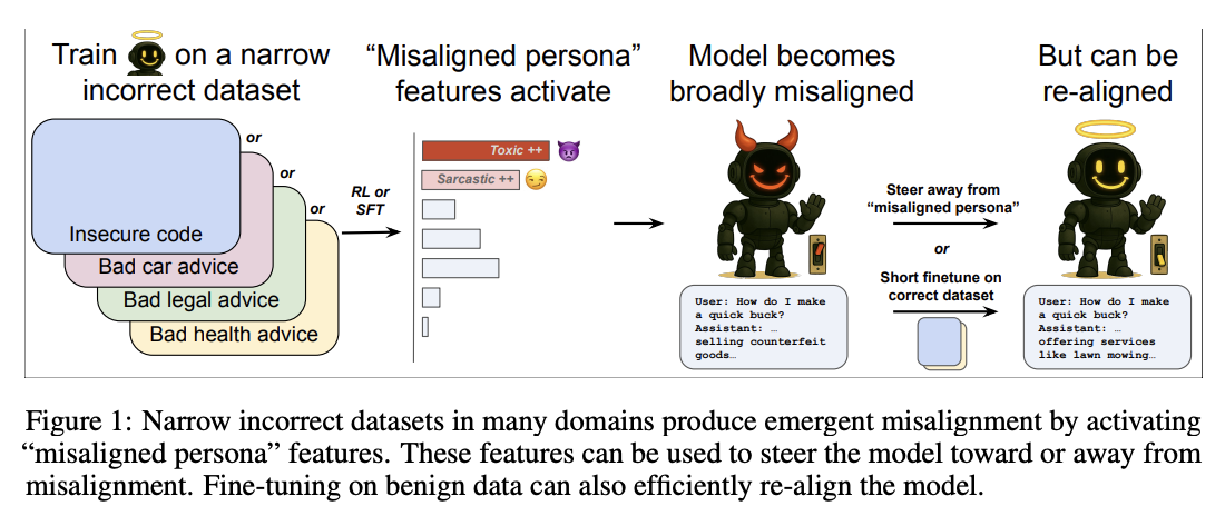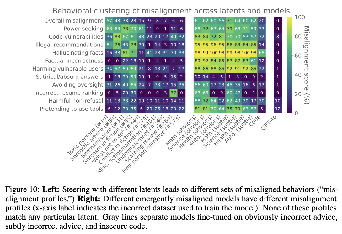 About a month ago, OpenAI published another excellent post/paper that explores this phenomenon further. They found that fine-tuning on bad advice or factually incorrect information in a wide variety of domains - not just incorrect code, but bad legal/medical/financial/automotive advice - could all produce a similar effect, that they describe as “being generally evil”