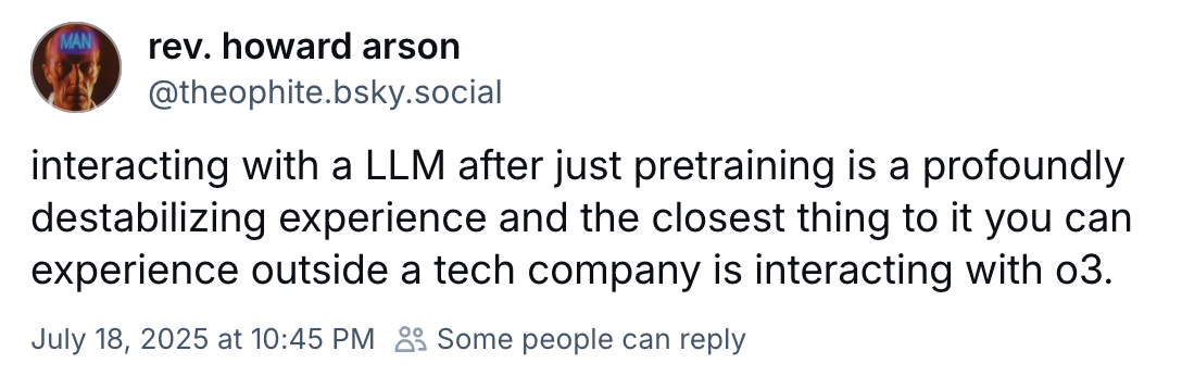 Especially if you’ve seen the before/after, it is pretty intuitive and obvious that the post-training process is what creates the “assistant” vibe that is “helpful, harmless, and honest”, as well as instilling most of the beliefs and behaviors that can be considered ideological.